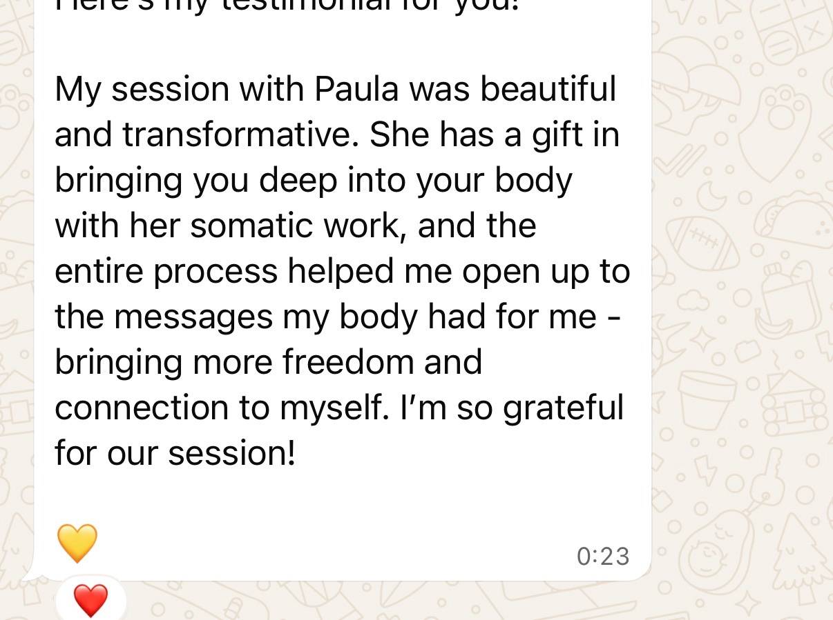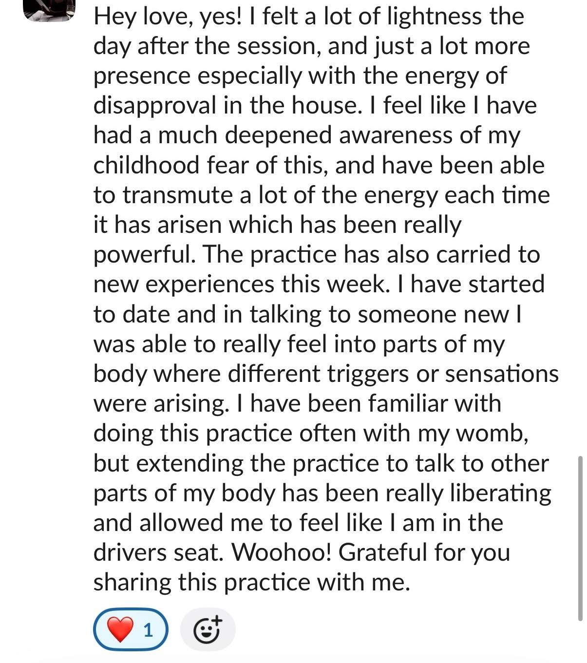 Each session gives you new somatic work, parts work, and energy practices, including guided somatic release, protector softening, inner-child repair, and live energy clearing work. - WhatsApp support (Mon–Fri)