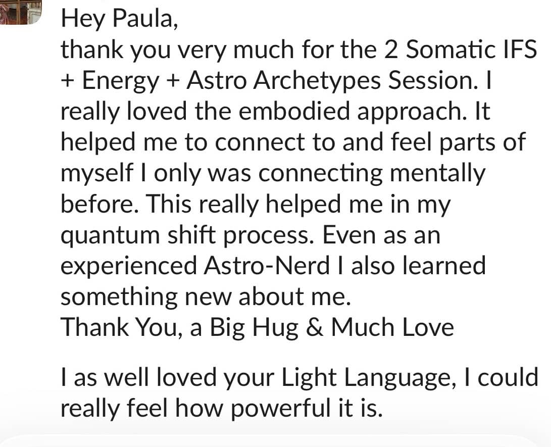 I’m a certified Psychosomatic and Parts Work practitioner, Reiki energy healer, and astrologer.